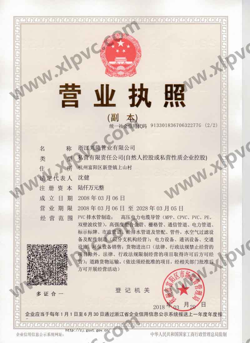 浙江興隆管業(yè)有限公司位于杭州市富陽區(qū)(杭州第九新區(qū)),坐落在新登鎮,相距杭州僅60公里,水、陸、空交通運輸十分便利。浙江興隆管業(yè)有限公司前身為富陽興隆塑料制品廠,成立于1992年,2008年改名浙江興隆管業(yè)有限公司,數十年來,公司一直至力于管道的生產,目前公司擁有國內先進的CPVC保護管生產線,HPVC()雙壁波紋管生產線,多孔管生產線,玻璃鋼電纜保護管生產線、MPP電纜保護管生產線。生產的主要產品有:CPVC電纜保護管、MPP電力電纜保護管(頂管)、高強度塑合金管、HDPE給排水管、HPVC()雙壁波紋管、玻璃鋼電纜保護管、埋地通信用的PVC-U多孔管、PE直壁管、PVC-U雙壁波紋管、梅花管等,年生產能力達20000萬米。
